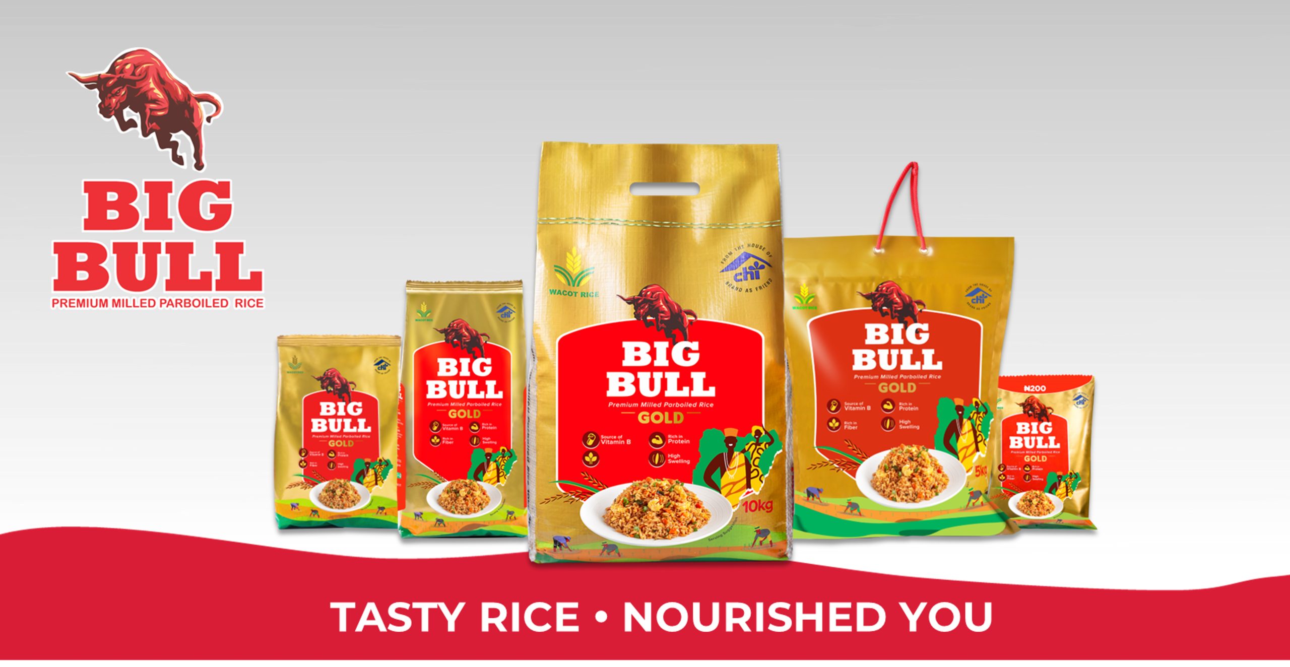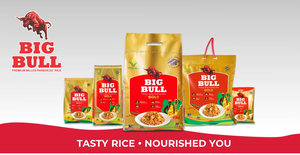 Big Bull Rice is Nigeria’s foremost parboiled rice. Big Bull is premium milled, stone free, with an excellent swelling index that retains the natural taste & texture of goodness from the Nigerian soil. An absolute cooking delight with the best texture, uniform size and shape; each grain is highly nutritious, rich in B-vitamins, Iron, Dietary Fibers and Protein, with low Glycemic Index for a healthy consumption. Big Bull is the ideal choice for great tasting rice dishes, be it jollof rice, fried rice, white rice, coconut rice and many more. Available in various consumer-friendly pack sizes nationwide.