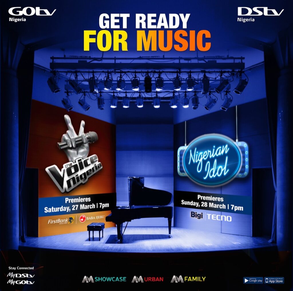 The Voice Nigeria will premiere Saturday, March 27 on AM Showcase (DStv 151), AM Urban (DStv 153), and AM Family (DStv 154, GOtv 2) at 8 pm while Nigerian Idol main show starts Sunday, March 28 also on AM Showcase (DStv 151), AM Urban (DStv 153), and AM Family (DStv 154, GOtv 2) at 7pm.
