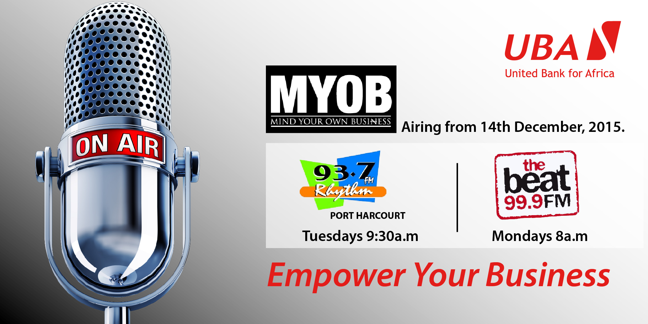 Mind Your Own Business (MYOB) is a 30 minute weekly business radio programme. The show is brought to you by United Bank for Africa (UBA), Africa’s global bank and is targeted at self-employed individuals as well as other entrepreneurs navigating the Nigerian business landscape.