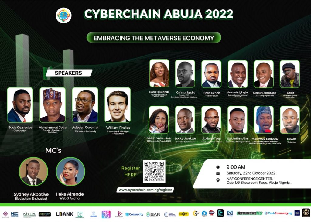 Cyberchain events are supported by Zinochrome, NCC, NITDA, Digital Encode, Binance, TradeFada, Bitmama, FBM Homes, Convexity, RedswanCRE, LBank, FTX, Adbond, Gamic Guild, Adaverse, Emurgo, BEI, AAX, Farmchain,  SiBAN, Boundless Nexus, Rocket, CryptoTV Plus, LenzOne, ChannelsTV and others.