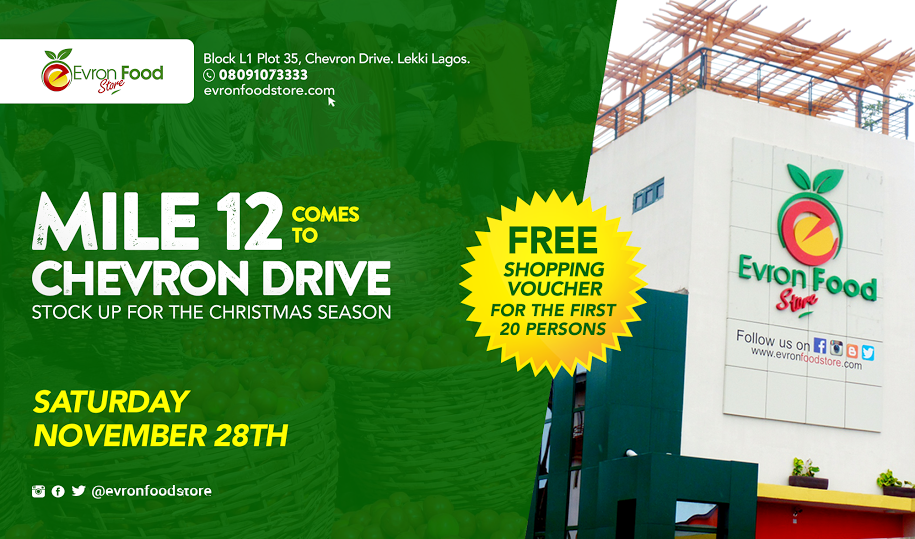 Worried on how to go about your fresh food shopping this festive season? Nigeria’s leading online food store, Evron Food Store,www.evronfoodstore.com, brings Mile12 to Chevron Drive its first Farmers Market Day, this Saturday 28th November, 2015. Get fresh food stuffs at amazing prizes, shop for plantain at just N1000 per head and even yam for as low as N300 per tuber, also a live broiler chicken for as low as N1500 and so much more.