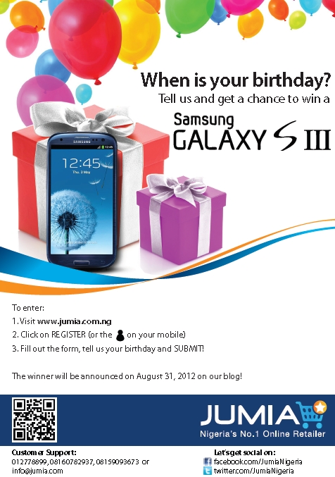 To celebrate its launch, JUMIA is offering free delivery anywhere in the country and announcing its Samsung Galaxy S3 giveaway competition. To enter for this giveaway, all you have to do is;