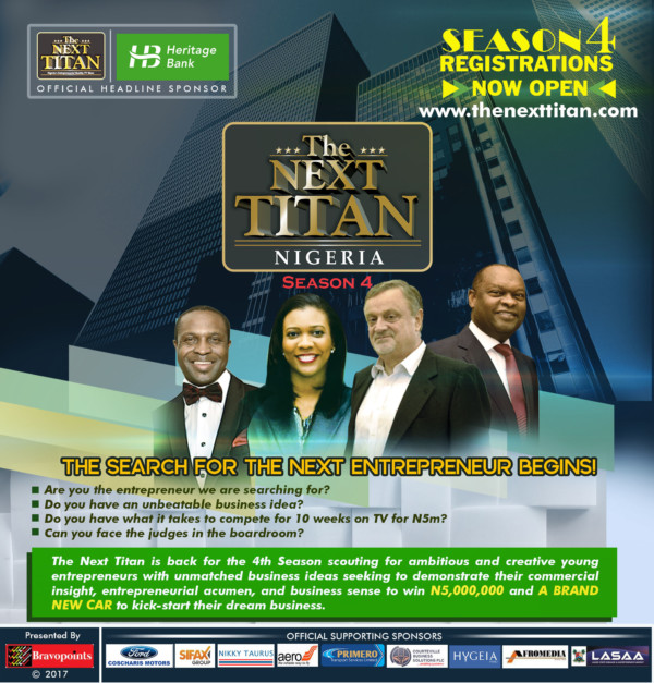 Nigeria’s foremost entrepreneurial reality TV show, The Next Titan sponsored by Heritage Bank is back for the 4th Season scouting for ambitious entrepreneurs seeking to demonstrate their entrepreneurial acumens with unbeatable business ideas, commercial insight and business savvy to stay out of eviction line in order to win N5,000,000 and a brand new car for the support of their business.