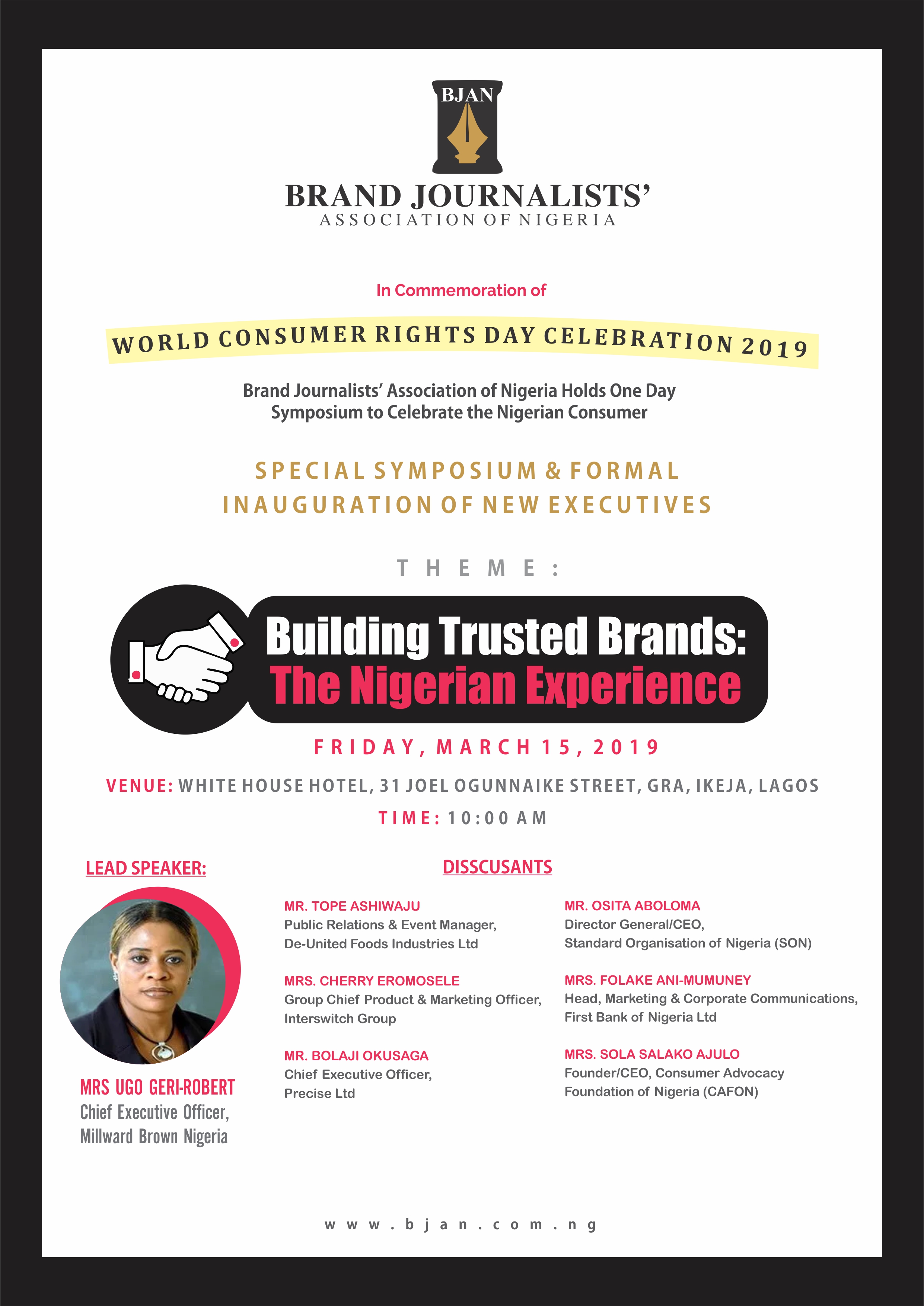 The Chief Executive Officer of Kantar Millward Brown, Mrs. Ugo Geri-Robert is expected to deliver a keynote address at this year’s World Consumer Rights Day Celebration, an annual event organised by Brand Journalists’ Association of Nigeria (BJAN).The symposium is being organized as part of BJAN’s effort to join the rest of the global community to deepen discussions on issues affecting consumer with particular focus on the challenges of consumers in Nigeria.