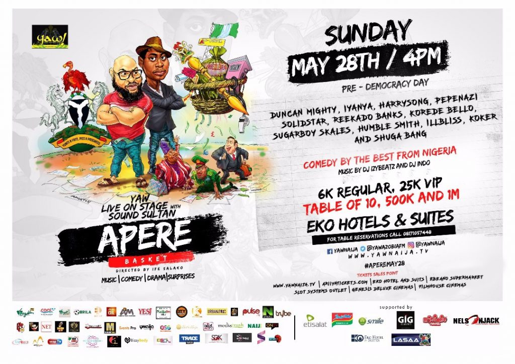 Widely celebrated OAP-comedian Steve Onu otherwise known as Yaw alongside veteran singer Sound Sultan addressed an array of issues plaguing the country through their recently concluded stage play titled ‘Apere’, which held on May 28, 2017 at EKO Hotels Convention Centre, Victoria Island, Lagos.